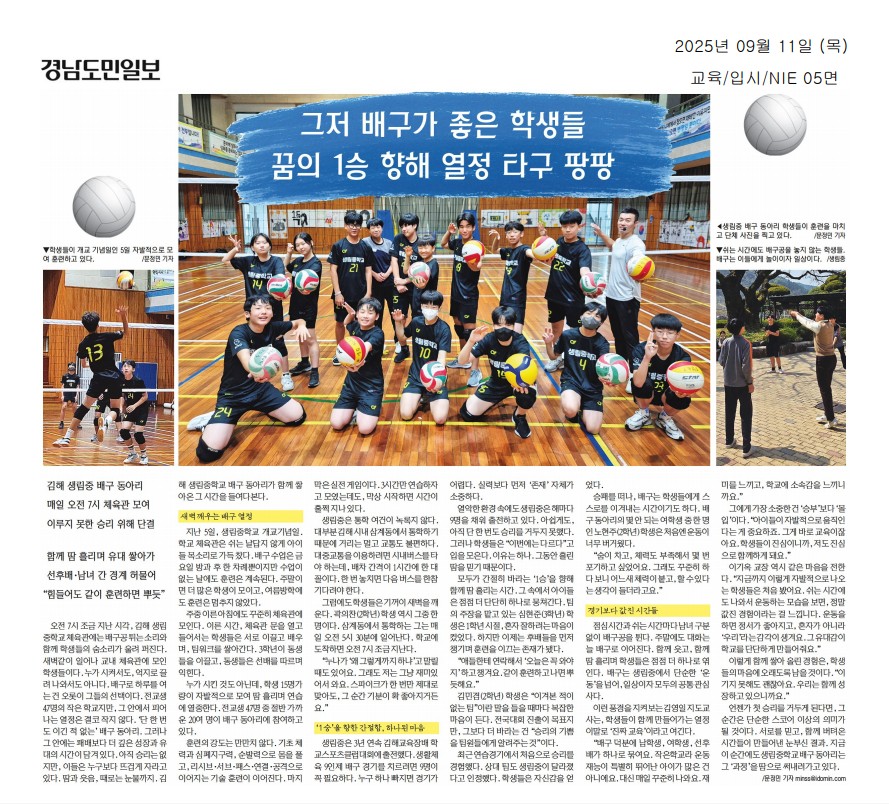 2025. 생림중학교 "배구동아리" 언론보도(경남도민일보 9.11자)